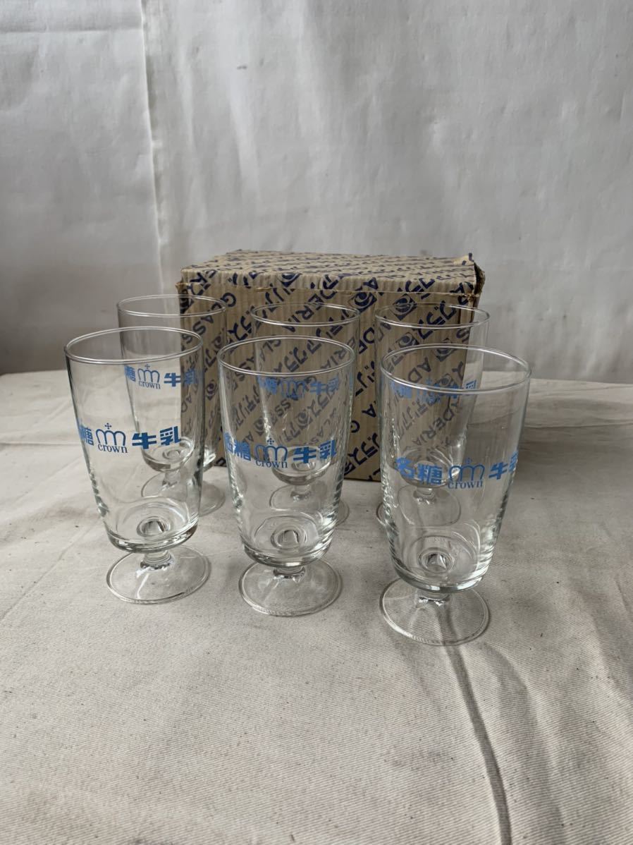 - 箱入り未使用デッドストック アデリアガラス 名糖牛乳の脚付グラス6個セット 昭和レトロアンティークビンテージ古道具コレクション硝子珍品