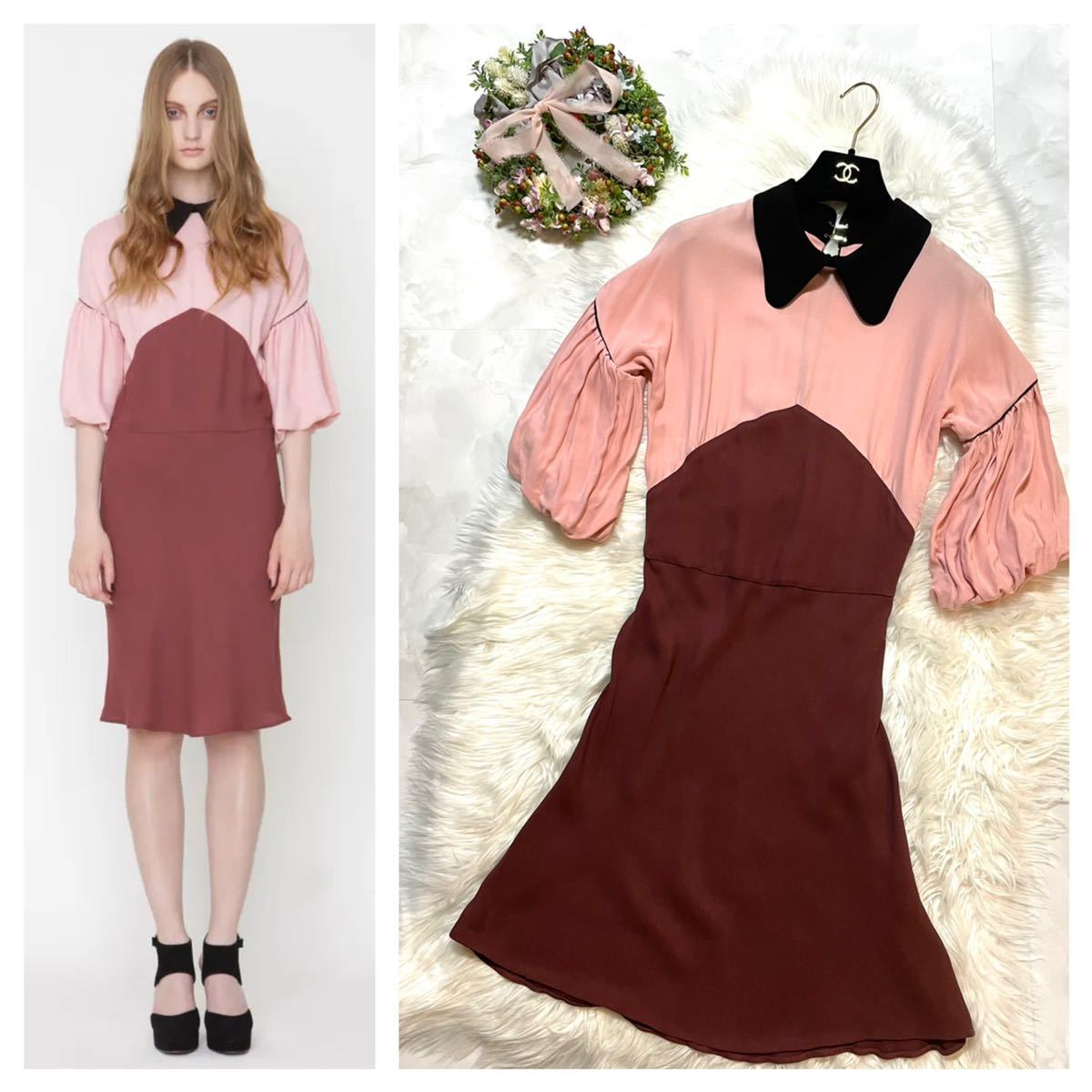 - 本物 コレクションモデル マルニ 七分袖 ロング ボリュームスリーブ 配色切替 ワンピース ドレス 38 ピンク 黒 茶 38 MARNI