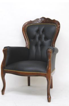 > イタリア輸入 アンティーク調 ブラウンウッド木枠 バロック調ブラックレザーハイバックシングルソファ