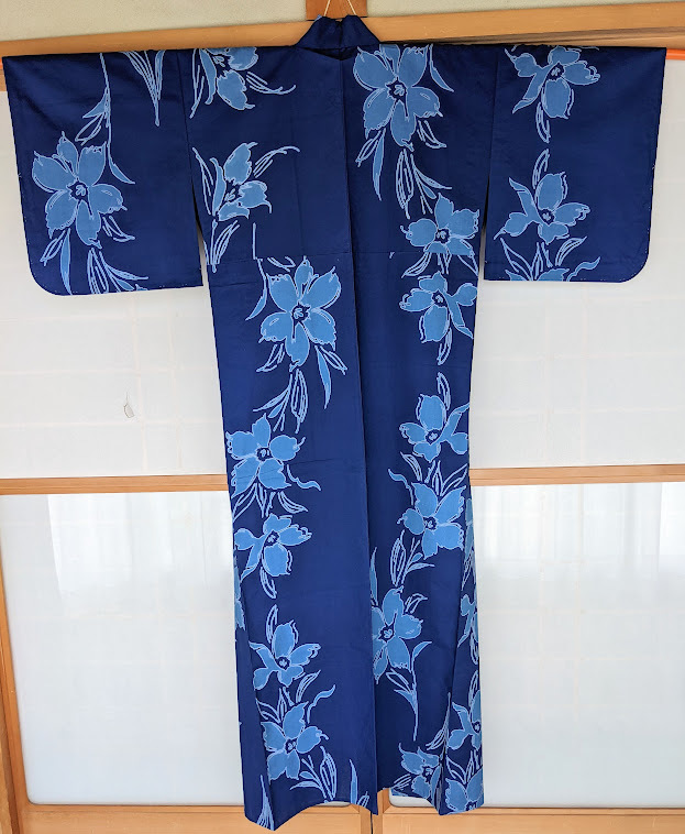 - ゆかた 花柄 未使用品 身丈(肩から)158cm 袖丈45cm 裄丈 64cm 袖巾33cm 肩巾31cm しつけ糸付き