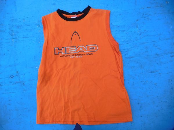 > T-shits Tシャツ AZno.192HEAD FUTURISTIC SPORTS GEAR 1950 オレンジ150 B70-78 ノースリーブ 綿100 上着 古着 used ティーシャツ