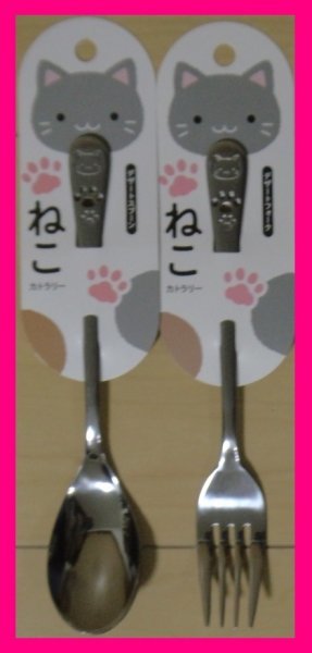 - 【送料無料:猫:カレー スプーン と フォーク:カトラリー:2本:日本製】★18cm:可愛い「ねこ」柄:スプーン & フォーク★食器 カトラリー:S