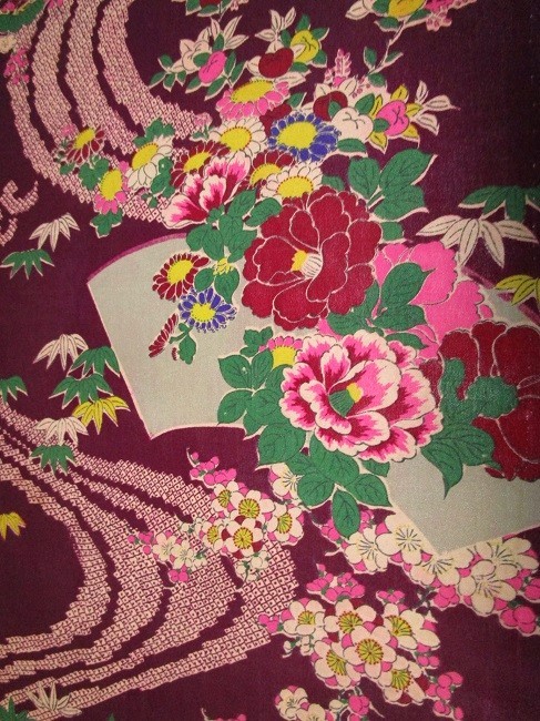 > C-51★赤紫*扇面*牡丹*椿*立花*松竹梅*正絹*古布はぎれ★文化人形/一閑張り/吊るし雛/市松人形