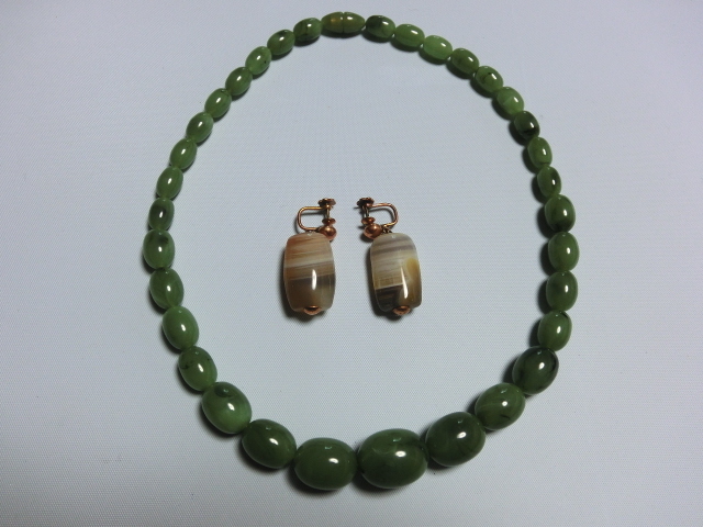 - ■美品:上品なウグイス色ネックレス+メノウ?イヤリング Tm984