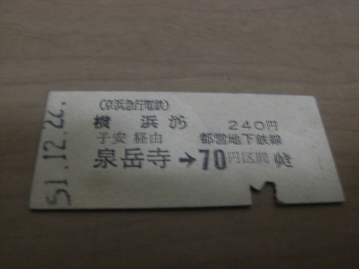- 京浜急行都営地下鉄連絡乗車券 横浜から240円 子安経由 泉岳寺→都営地下鉄線70円区間ゆき 昭和51年12月22日 横浜駅発行