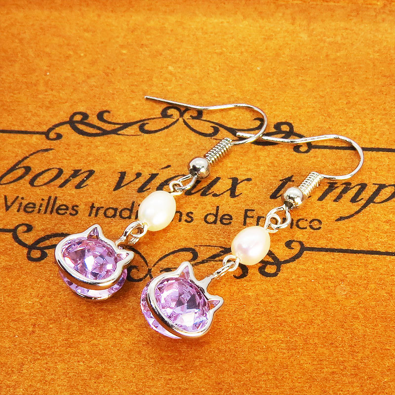 - 猫フレームのスワロフスキー(ヴァイオレット)と淡水パールを組合せた大人可愛いフックピアス サージカル可