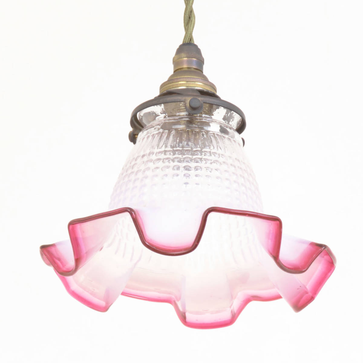 - 赤い縁のアンティークランプシェード/オパールセントガラス/吊り下げ/ペンダントライト/引掛けシーリング/店舗什器/インテリア雑貨/A-2120