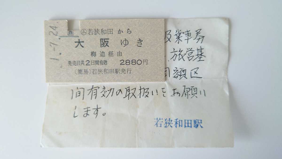 - ▽JR西日本▽ム若狭和田から大阪ゆき乗車券▽A型硬券平成1年(お知らせ付)