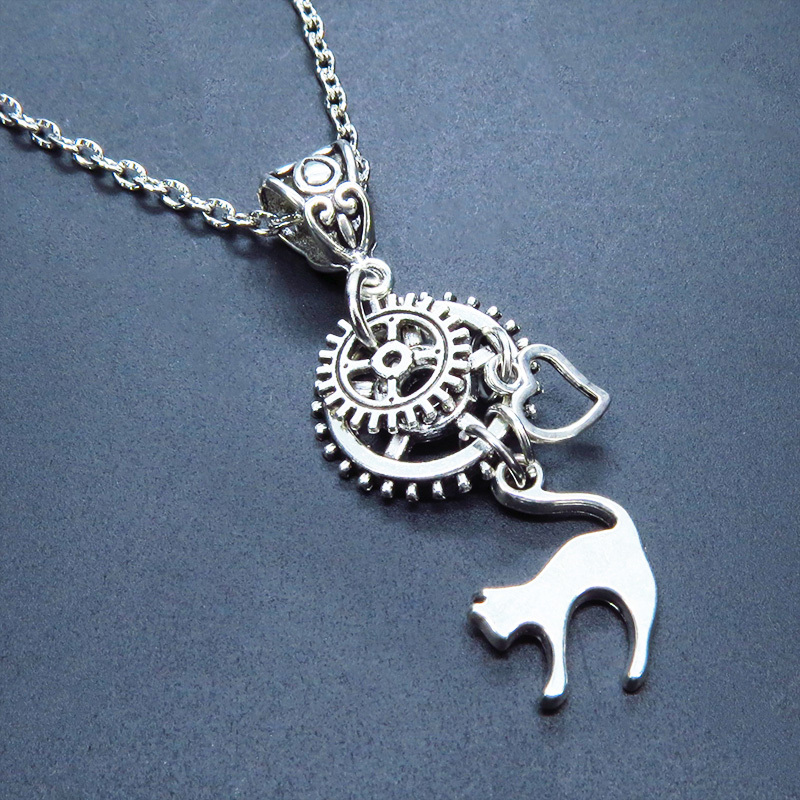 - アンティークシルバー 跳ね猫と大小異なる歯車を組合せたスチームパンク風ネックレス コンパクト オープンハート