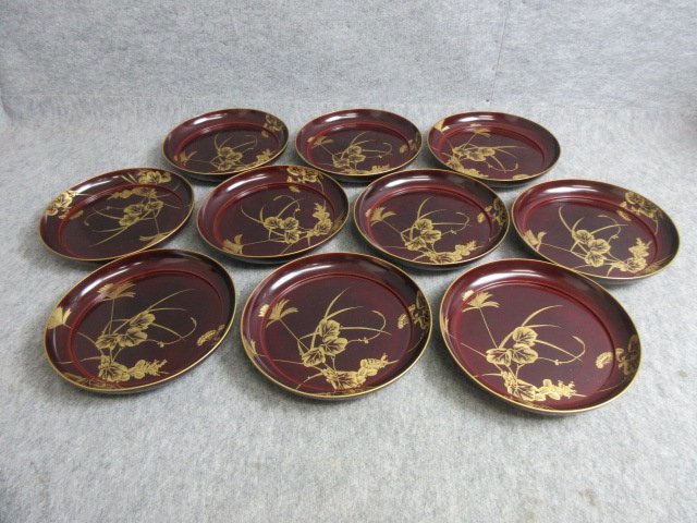 沈金 銘々盆 10枚です。寸法は高さ4cm、直径21cmです。状態は主観ですが綺麗だと思います。120サイズ、ゆうパックで発送を予定しています。