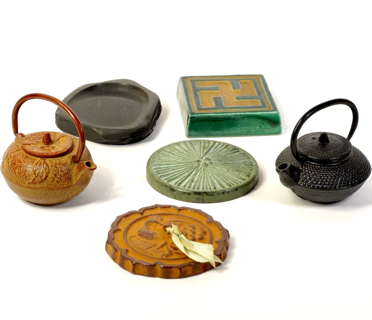 - 昭和ビンテージ 山梨県雨畑真石硯付 小物6点セット 七宝焼卍紋文鎮/南部鉄器水差二点/鉄製文鎮二点 書道具小物コレクション SCC411