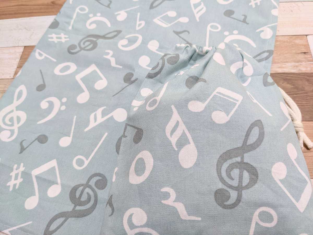 - *40×60cm*ハンドメイド*ランチョンマット・巾着袋給食セット*アッシュブルー×音符柄*入園・入学・新学期準備*小学校