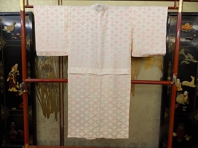 - きもの今昔4440 長襦袢 バチ衿袖無双身頃単衣仕立 正絹五枚繻子七宝模様 淡いピンク色地に濃いピンクのドット柄