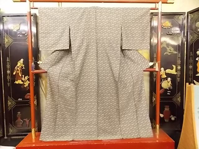 - きもの今昔4462 御召きもの 単衣広衿仕立て 正絹先染お召地 黒白図案模様柄織 美品 身丈157cm
