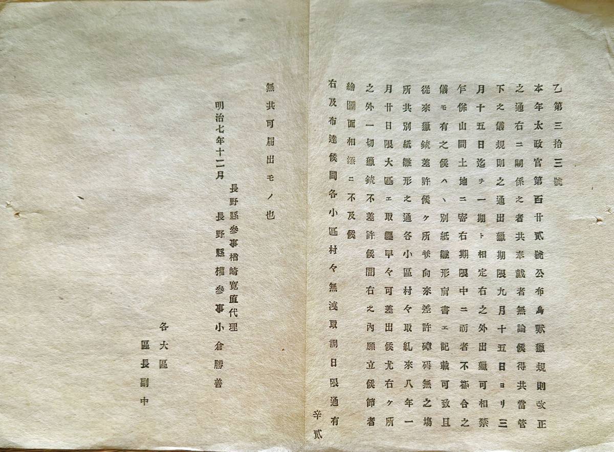 - D22112611〇明治布告布達 鳥獣猟規則改正 明治7年 長野県〇和本古書古文書