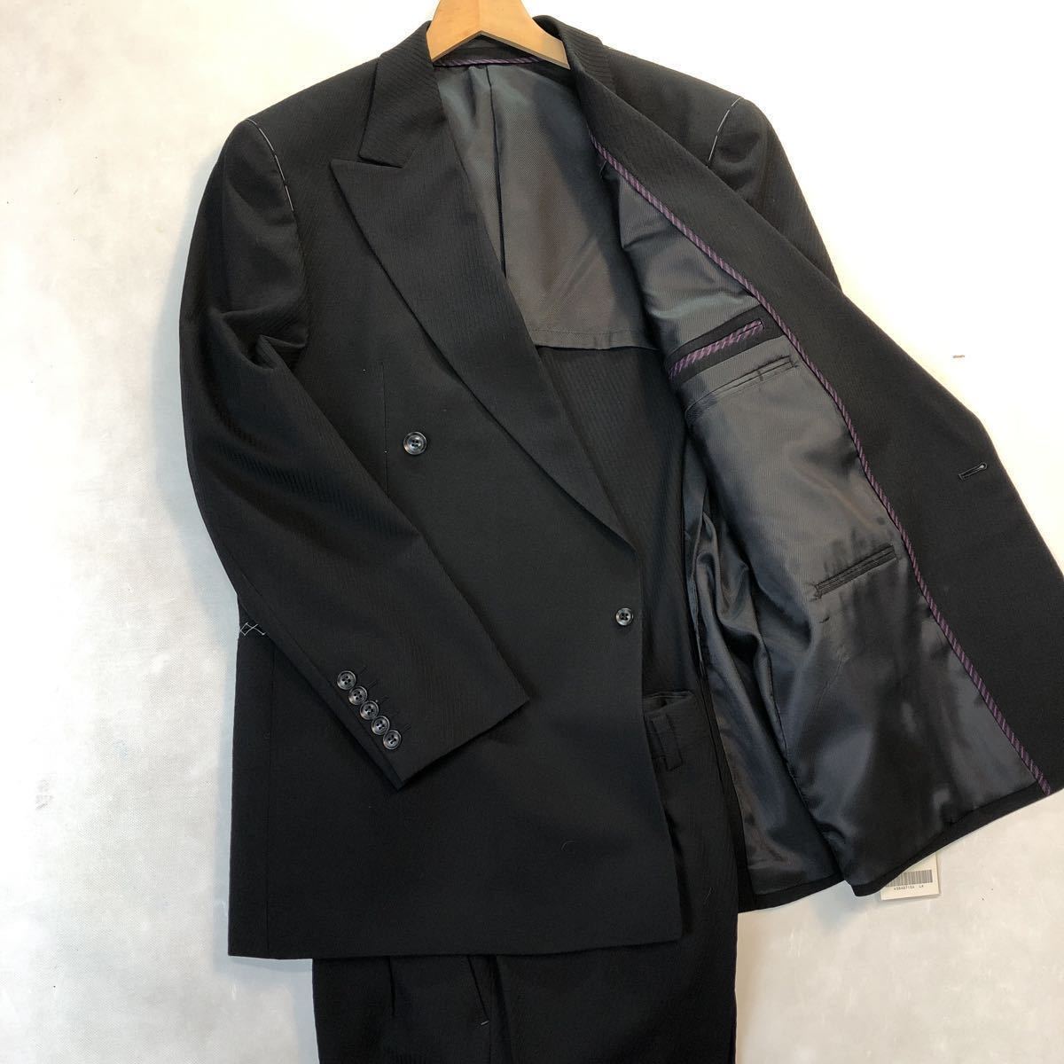 > 定価49,000円【サイズA7 LL★高級本台場仕立て】新品タグ付き4Bダブルスーツ ブラックストライプ背抜き/ノーベンツ 80cm/2タックブランド