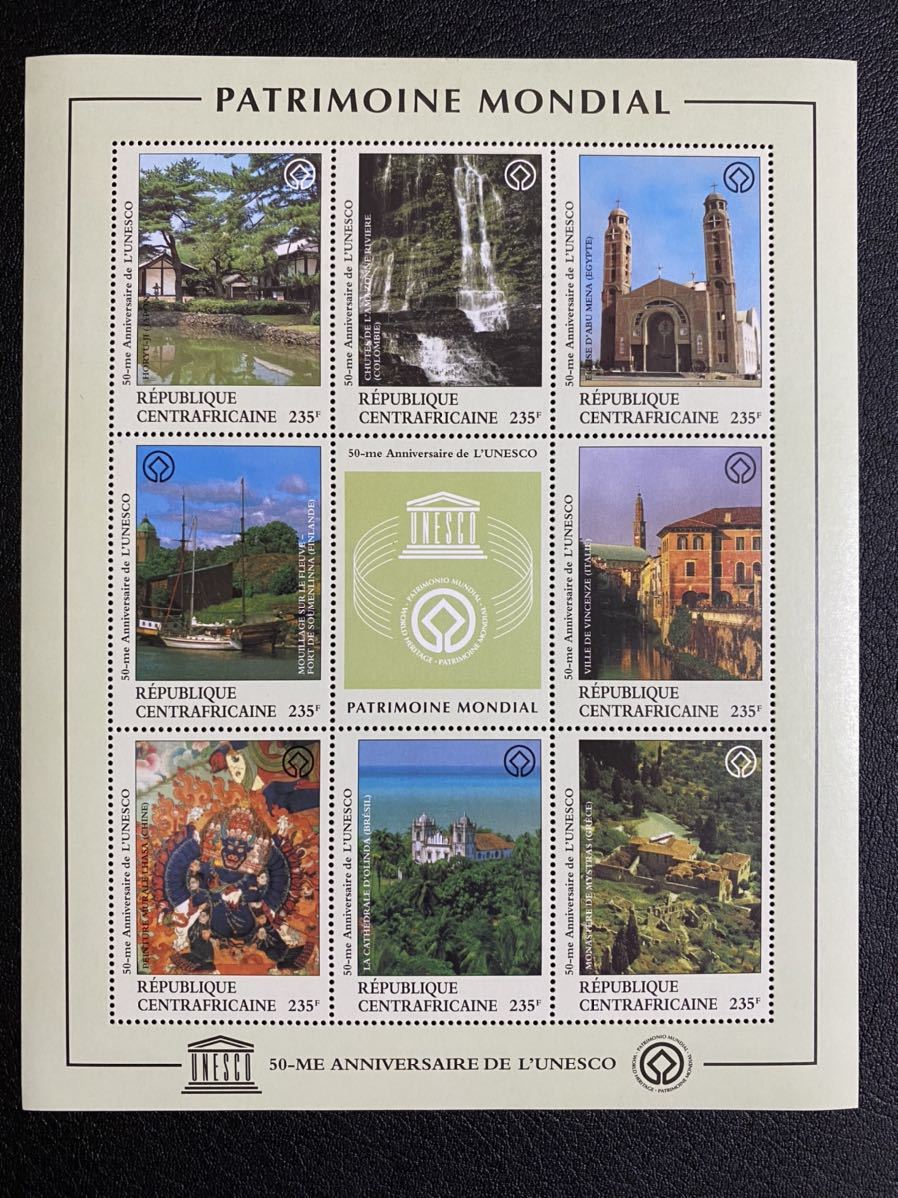- 中央アフリカ 法隆寺 オリンダ歴史地区 アブ・メナ 世界遺産 小型シート1種完 未使用 NH