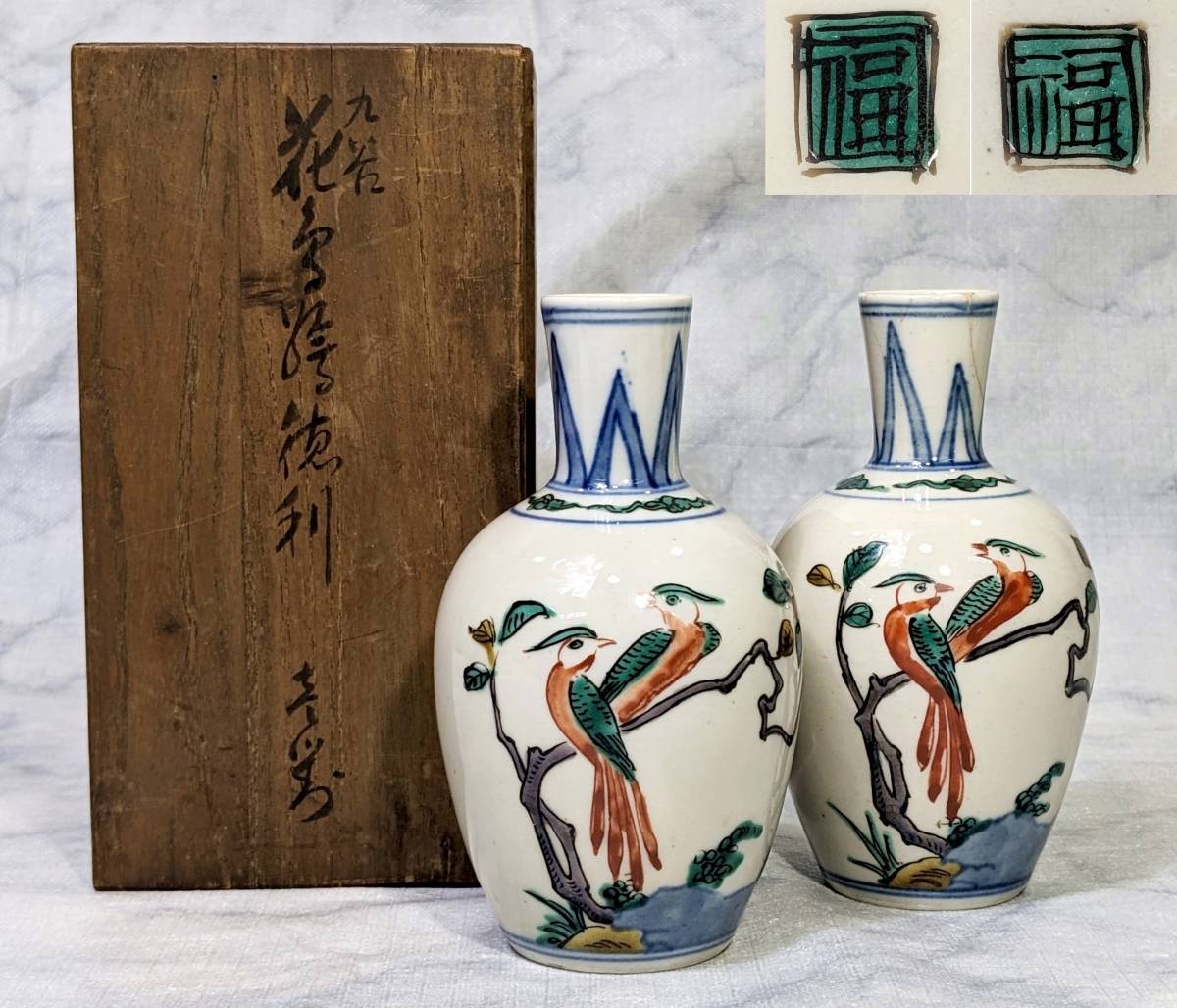 - ★九谷焼 花鳥図 徳利 一対 角福 共箱★時代もの 古九谷