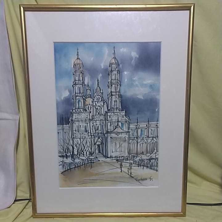 - No197 水彩画と思われる清家文博 カテドラル 前面ガラス入り 額に経年変化あり
