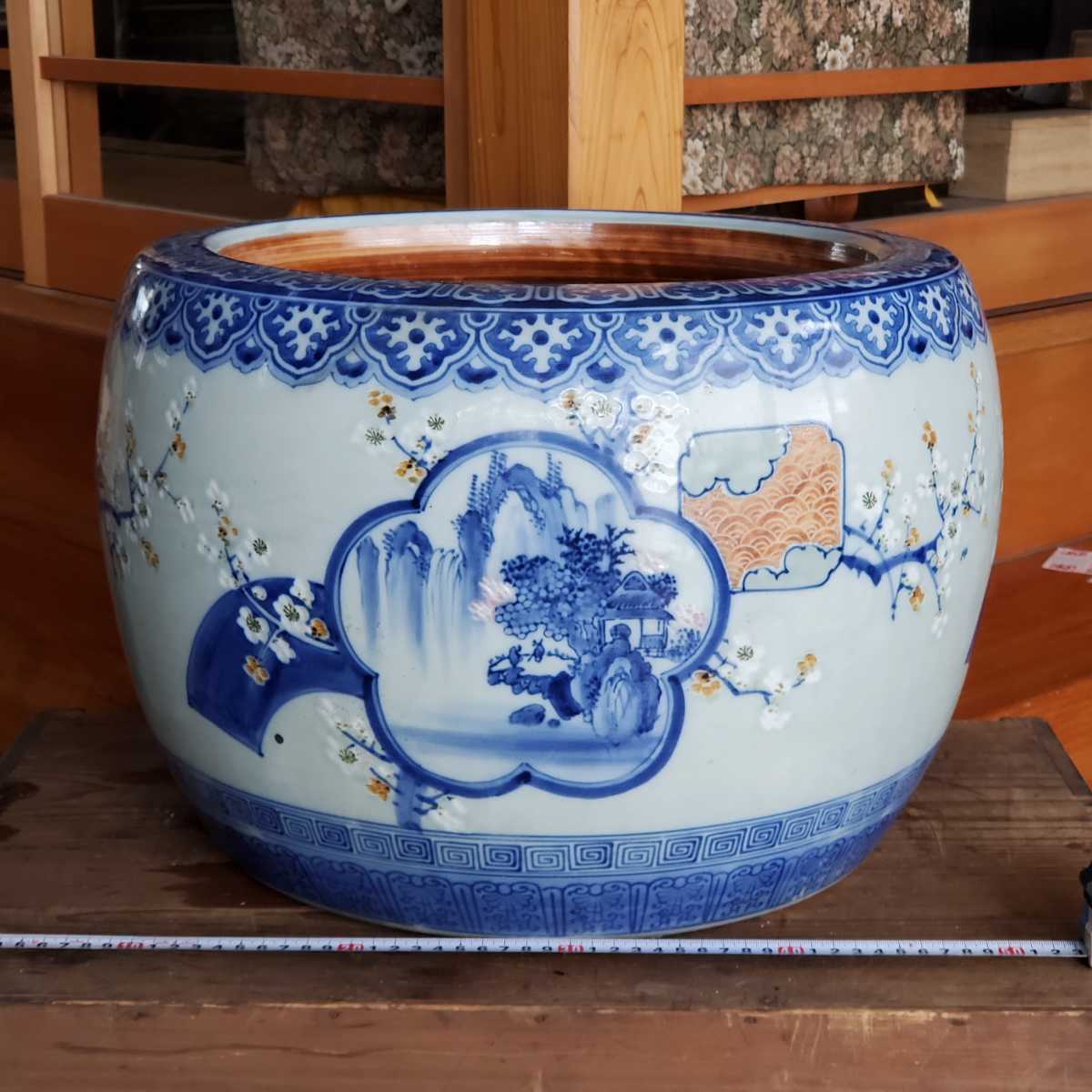 - 直径45cm 陶磁器 伊万有田焼 染付け 唐草 山水窓絵紋 火鉢 //検索 古民具 睡蓮鉢 メダカ鉢 自在鉤 鉄瓶 ディスプレイ 金魚鉢 b1/52