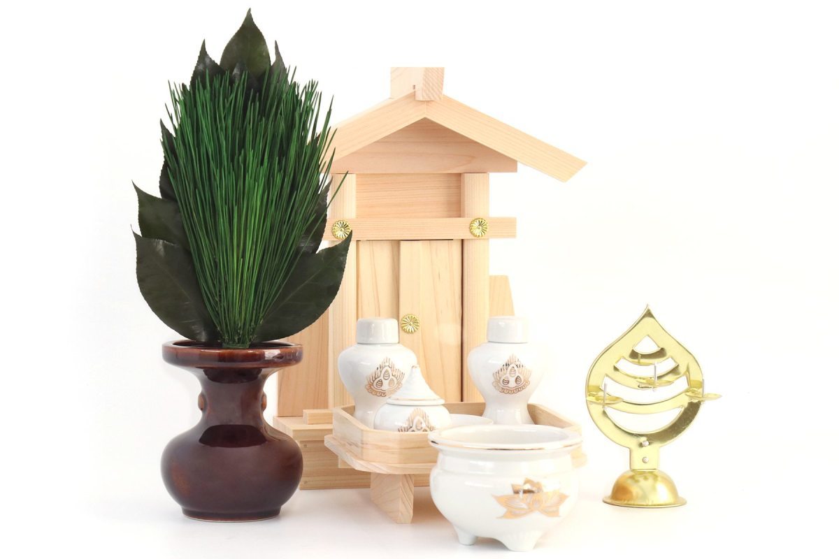 - 神棚セット 荒神宮 東濃桧 専用神具 榊 プリザーブド荒神松 荒神紋 陶器セット