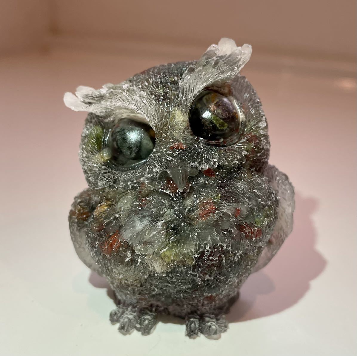 - フクロウのオルゴナイト ドラゴンズブラッドジャスパー パワーストーン 風水晶 置物インテリア 縁起物 クリスタル 魔除 お守 不苦労 幸運