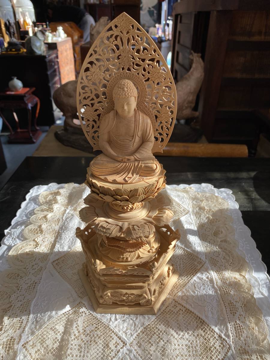 - 阿弥陀 座弥陀 ケマン座飛天光背 柘植 仏像 木彫