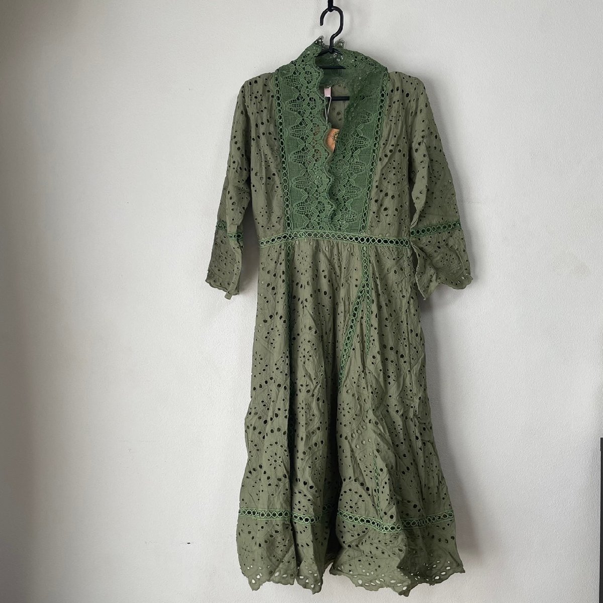 - ワンピース レース グリーン lideel 七分袖 ひざ丈 サイズM 未使用品