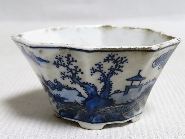 - 植木鉢 染付 青華 盆栽鉢 時代 No. A15-0215