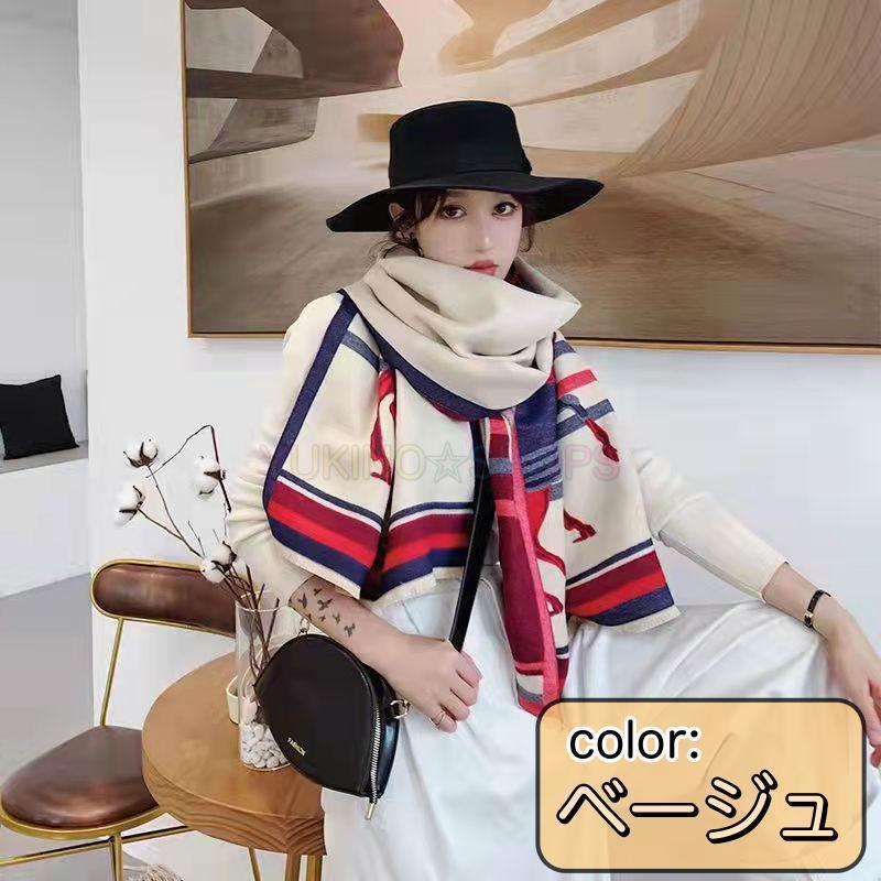 - 大判 ストール ベージュ マフラー ホース 馬 スヌード 厚手 防寒 カシミヤ調