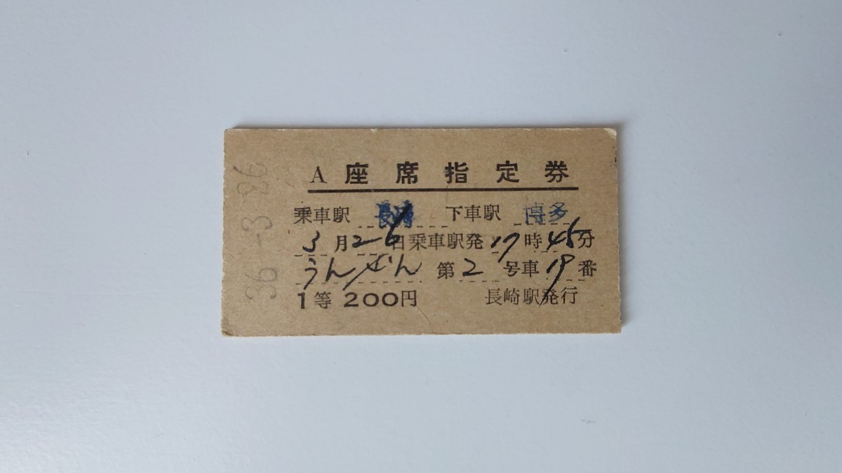 - ▽国鉄▽長崎→博多 雲仙座席指定券1等▽A型硬券昭和36年