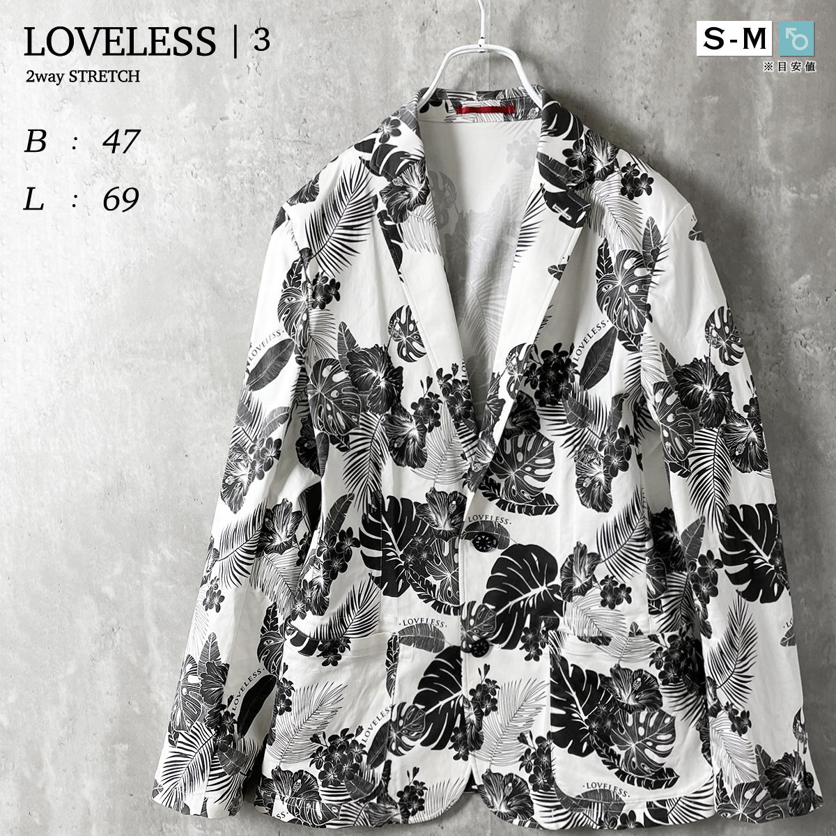 > LOVELESS 薄手 ボタニカル 柄 ジャケット 白 ホワイト 黒 バイカラー 総柄 ストレッチ カジュアル 春 夏 秋 綿 コットン 細身 ラブレス 3