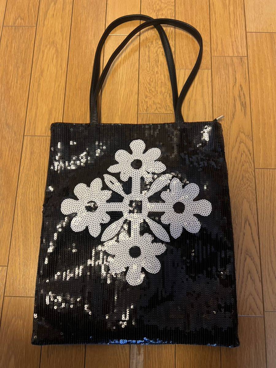 - 花柄 トートバッグ ブラック スパンコール 縫い付け 美中古