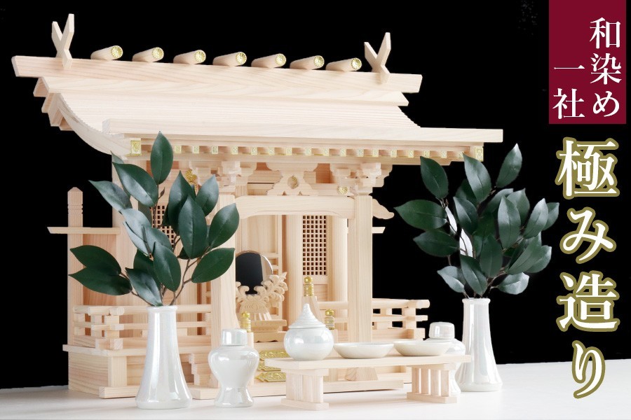 - 岐阜ひのき、特上 ■ 和染め ■ 純白 シリーズ ■ 匠造り ■ 流れ屋根 一社 八幡造 ■ 神棚セット 高千穂 ■ パール神具 家具調モダン神棚