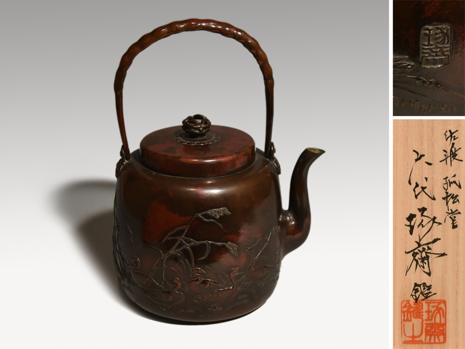 - 三代 本間琢斎(作) 斑紫銅 蘆雁文湯沸 六代 琢斎箱書 蝋型鋳金 水注 名品 金属工芸 美品 y1124