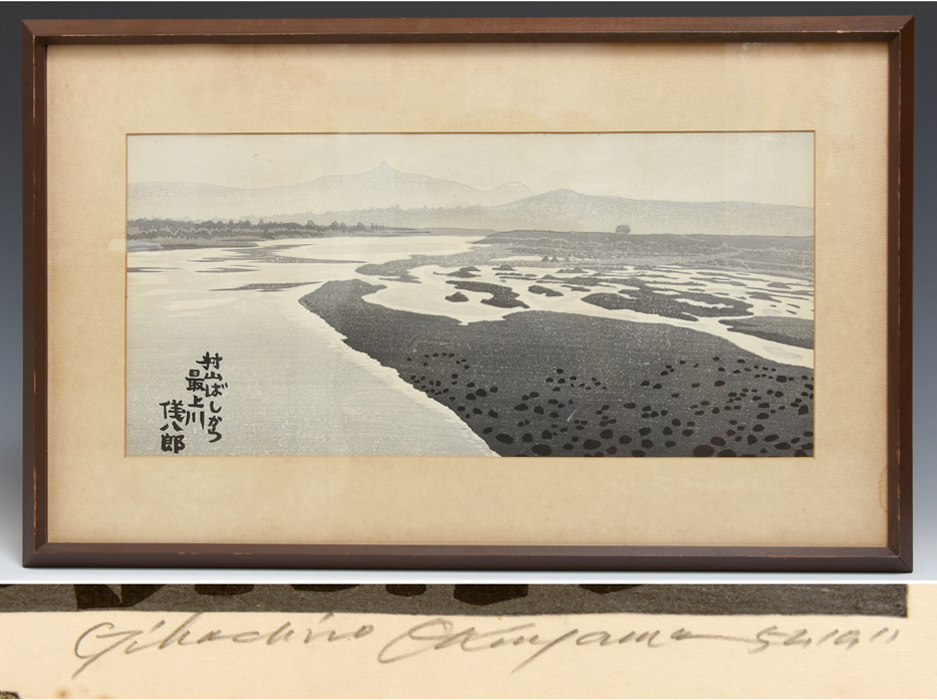 - 【真作】奥山儀八郎 木版画「日本風景版画 村山ばしから最上川」鉛筆サインあり 額装あり約55×34㎝ 共シール 版画 木版画 絵画 z3767o