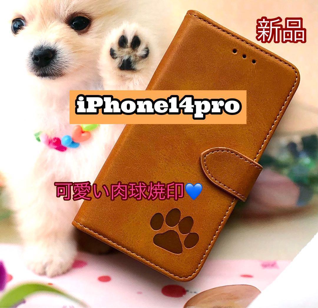 > 【iphone14pro専用】可愛い肉球刻印スムース加工レザーケースキャメル新品