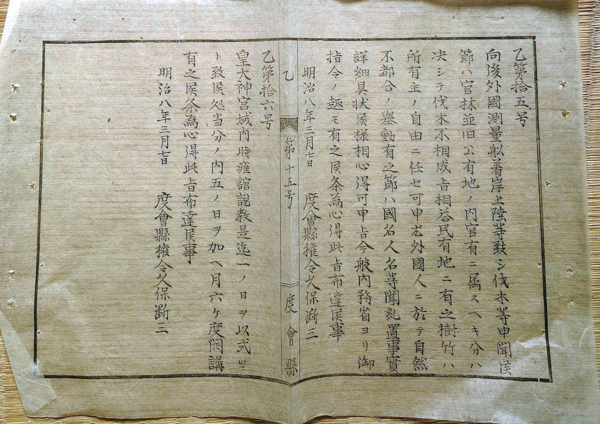 - f23030248〇明治布告布達 明治8年 外国測量船着岸上陸等致し伐木等申聞候節は 度会県 三重県〇和本古書古文書