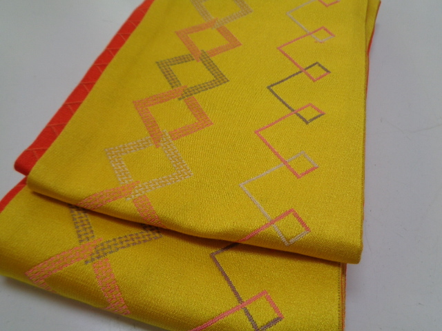 > d428-60 半幅帯 木綿 リバーシブル 隅入角織文 朱地檜垣織文 長さ約3メートル40センチ