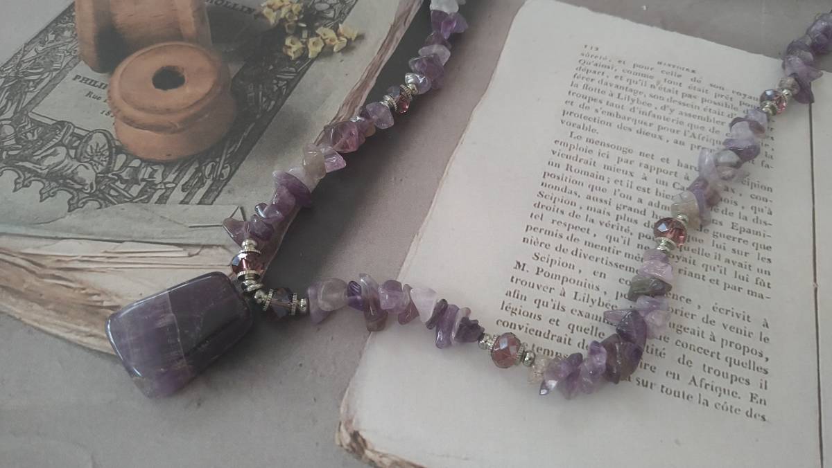 - 大きめストーンの存在感 紫色ストーン×多面カットビーズ ネックレス