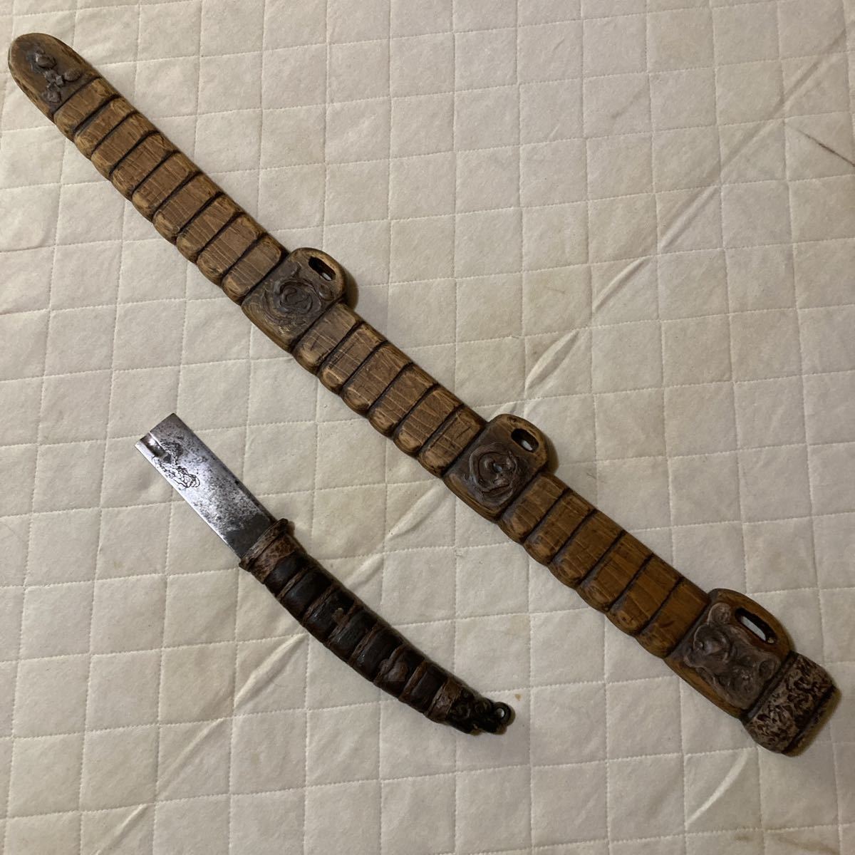 - アンティーク.アイヌ.残鉄剣.鞘は象嵌.木彫 掬は木彫.先に銅.龍の顔.頭.象嵌.逆刃刀.許可証不要.全体の重さ約1kg.全体の長さ.約10 2.3cm