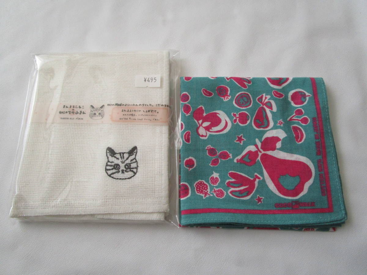 - かや生地ふきん ネコ刺繍 フルーツ柄 ハンカチ 未使用品