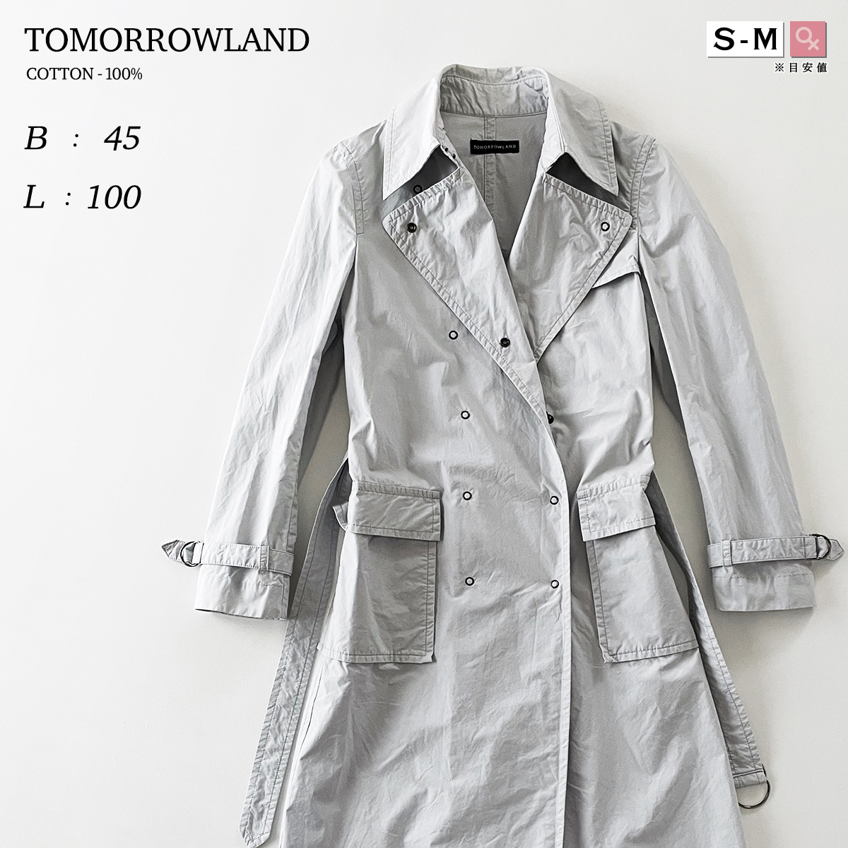 > TOMORROWLAND 薄手 スプリングコート 綿 100% コットン 灰色 ライト グレー 白 ロング 春 秋 ベルト Aライン トゥモローランド S - M 7号