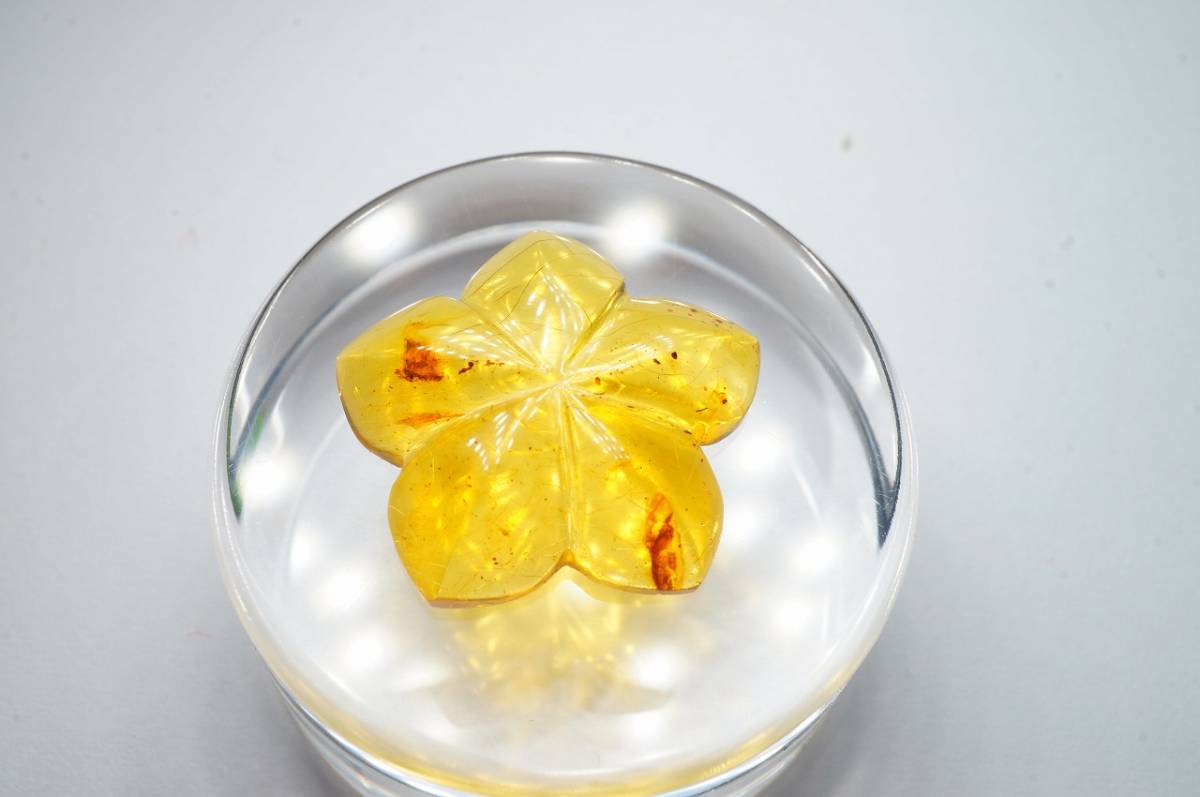 - 希少!35年前の未使用在庫!早い者勝ち!メキシコ産上質アンバー琥珀彫刻研磨「花」特大サイズルース3.5ct/0.70g高級宝飾品用