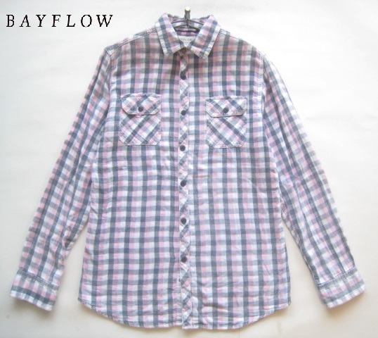 > 高級!!ベイフロー BAYFLOW*コンチョボタン ブロックチェック柄ダブルガーゼシャツ 実寸M 白×グレー×ピンク