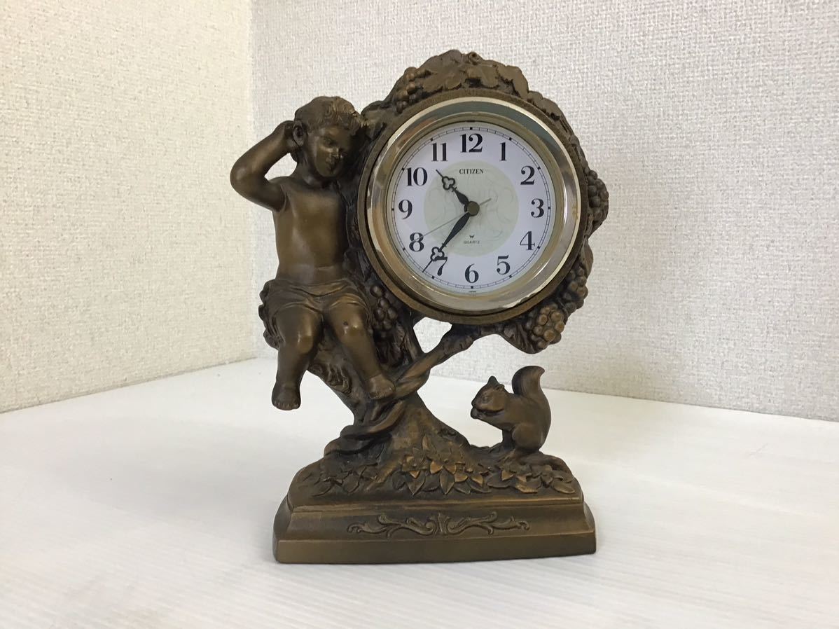 > CITIZEN/シチズン アンティーク 置時計 スイートロマン クォーツ 4RG887 天使 リス ぶどう ブロンズ? 高約25cm