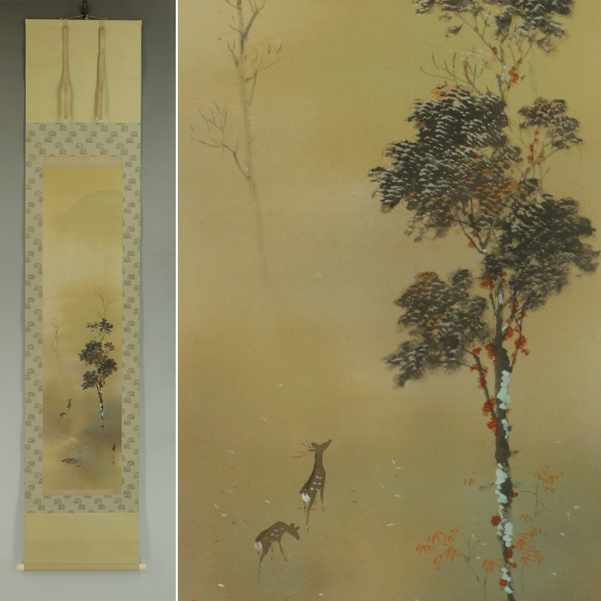 - 【真作】平早華舟【秋林遊鹿】◆絹本◆共箱◆掛軸 t01153