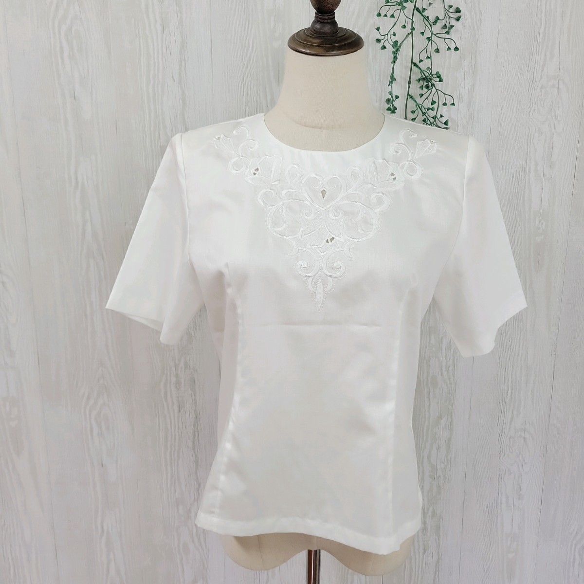 - 美品 昭和レトロ【Hana-no Blouse】花のブラウス 吉村 カットワーク刺繍のブラウス 半袖 刺繍 後ろボタン M~L レディース 春夏物 涼しげ