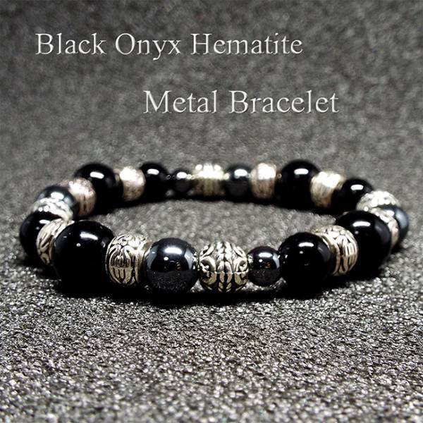 - パワーストーン オニキス ヘマタイト メタル ブレスレット 天然石 エネルギー 丸玉 アクセサリー