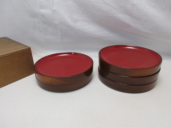 - I04154 【 美品 茶道具 天然木製 銘々皿 5枚揃 内朱 丸皿 木箱 】 検) 煎茶道具 茶懐石 和菓子 取分け皿 小皿 菓子皿 茶器 茶事 来客ⅰ